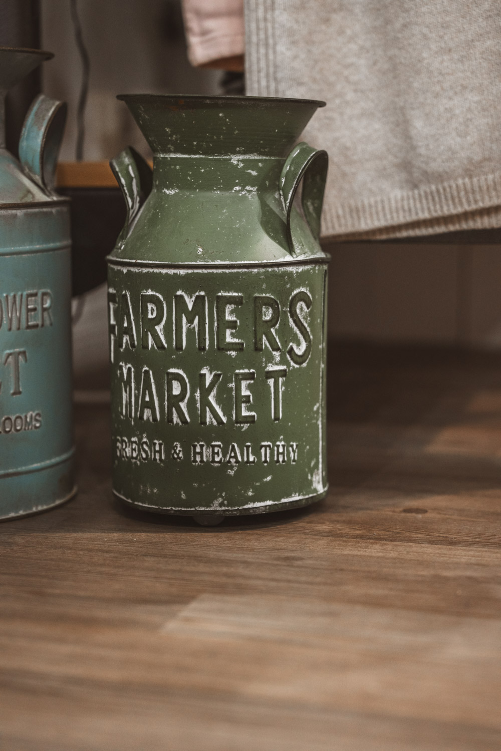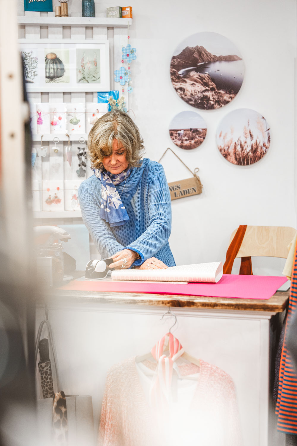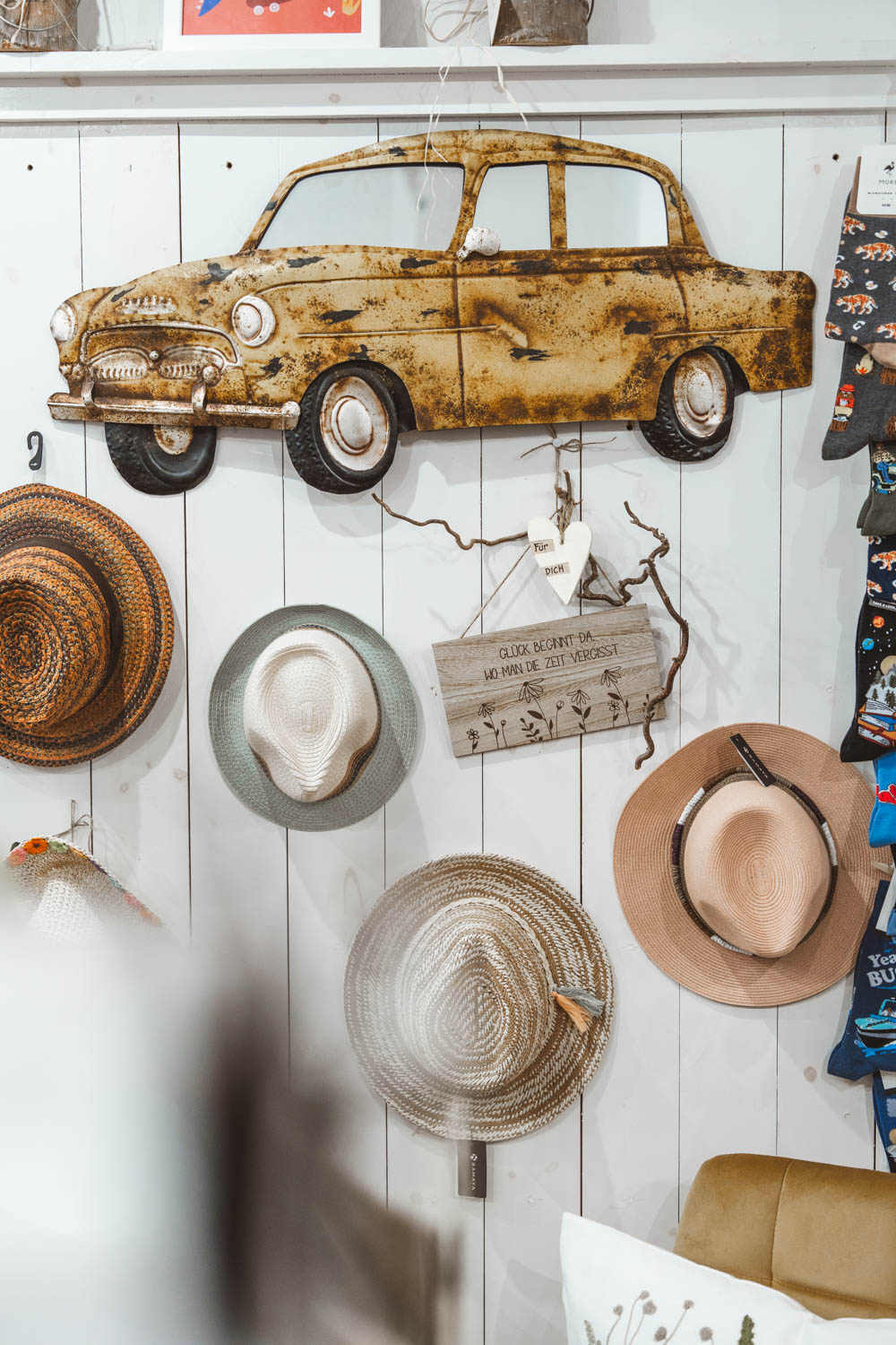 Unsere Ladeneinrichtung erinnert an ein skandinavisches Landhaus mit einer typischen Gemütlichkeit. Und tatsächlich stammen die großen Fenster von einem dänischen Hof. Das Highlight ist die alte Dielentür, die wir zu einer Umkleidekabine umgestaltet haben.